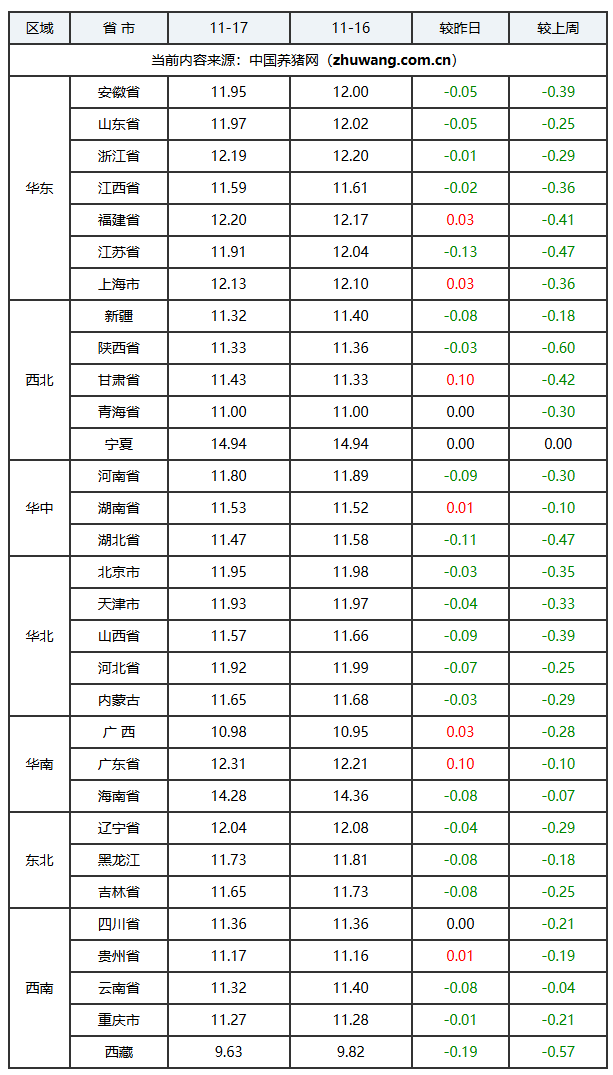 2025年11月17日-中国养猪网生猪(外三元)均价涨跌表