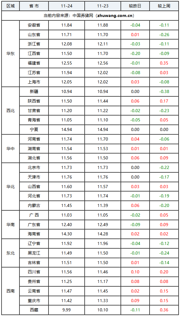 2025年11月24日-中国养猪网生猪(外三元)均价排行榜
