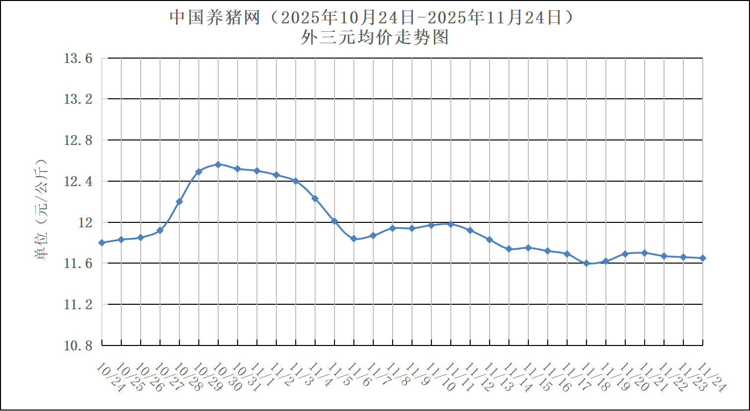 2025年11月24日-中国养猪网生猪(外三元)均价走势图