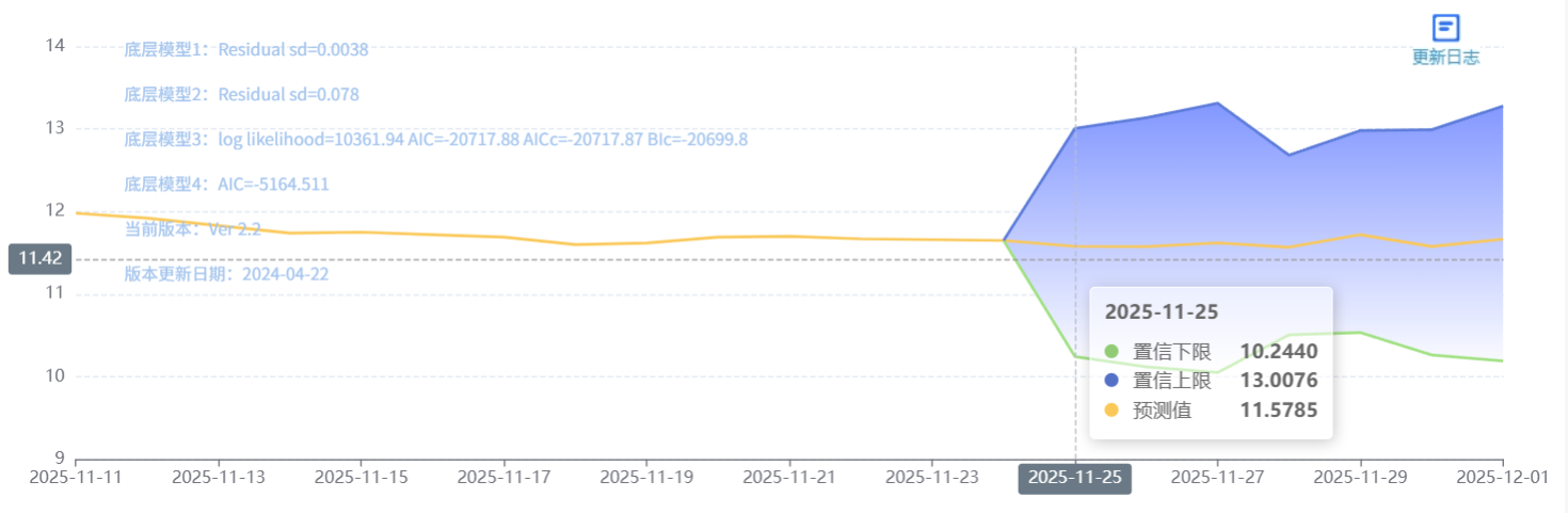 玄田算法是由项目课题组团队原创的非经典逻辑数值聚合理论和不确定性预测方法,构建了基于一致模算子的生猪价格预测模型。该模型采用的聚合函数及一致模相关理论与方法已获得多项国家自然科学基金和省级自然科学资金资助,并获得多项省级自然科学奖奖项。11月25日预测猪价为11.5787,置信区间在10.2440--13.0076之间。11月26日预测猪价为11.5755;11月27日预测猪价为11.6209。