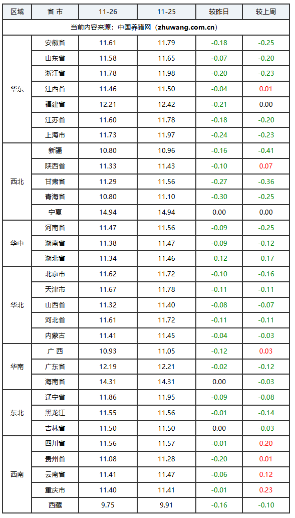 2025年11月26日-中国养猪网生猪(外三元)均价排行榜