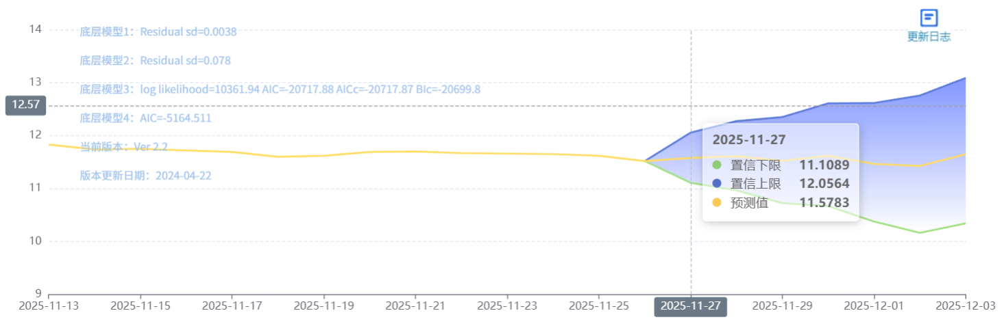 玄田算法是由项目课题组团队原创的非经典逻辑数值聚合理论和不确定性预测方法,构建了基于一致模算子的生猪价格预测模型。该模型采用的聚合函数及一致模相关理论与方法已获得多项国家自然科学基金和省级自然科学资金资助,并获得多项省级自然科学奖奖项。11月27日预测猪价为11.5783,置信区间在11.1089--12.0564之间。11月28日预测猪价为11.6103;11月29日预测猪价为11.5249。