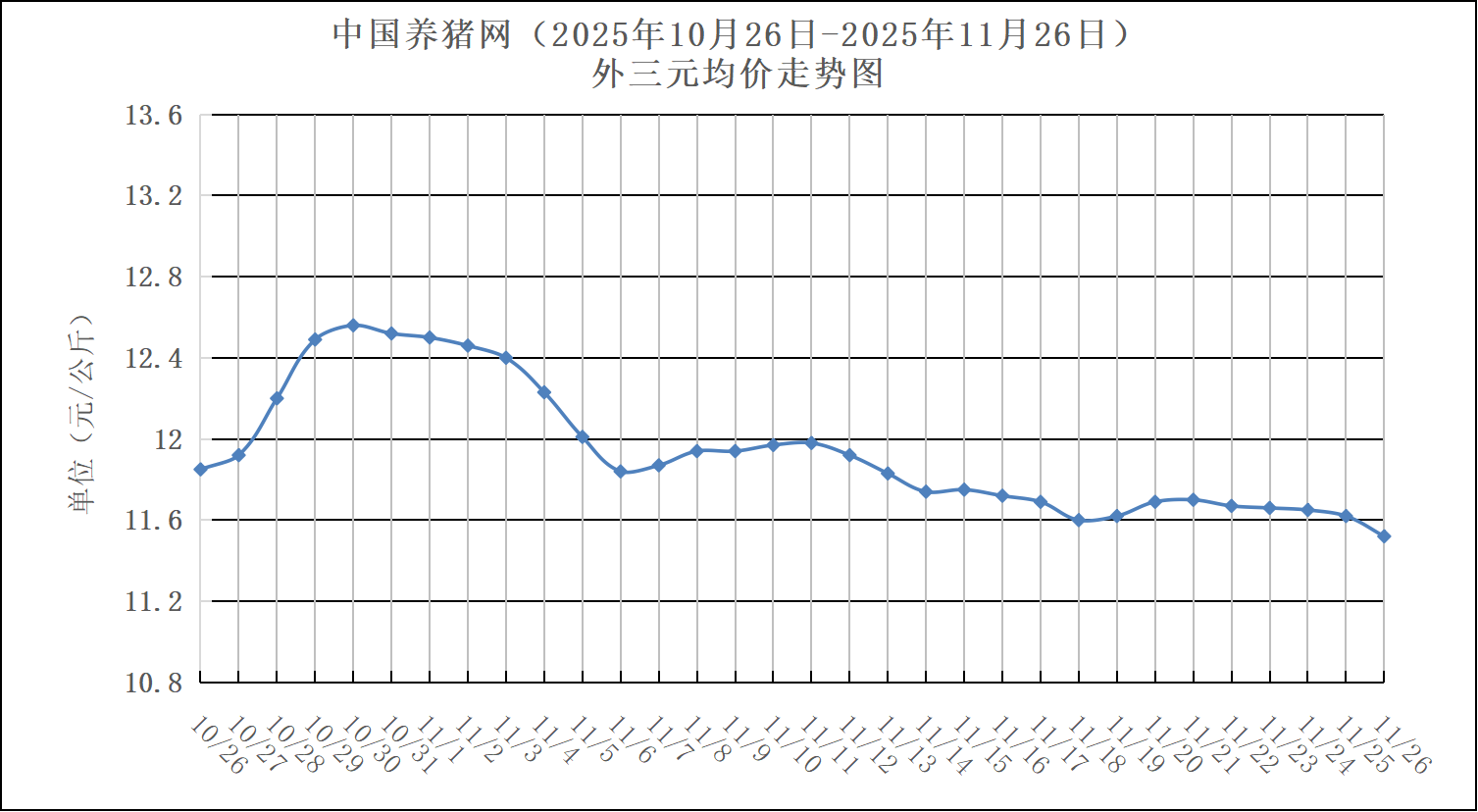 2025年10月26日-2025年11月26日中国养猪网生猪(外三元)走势图