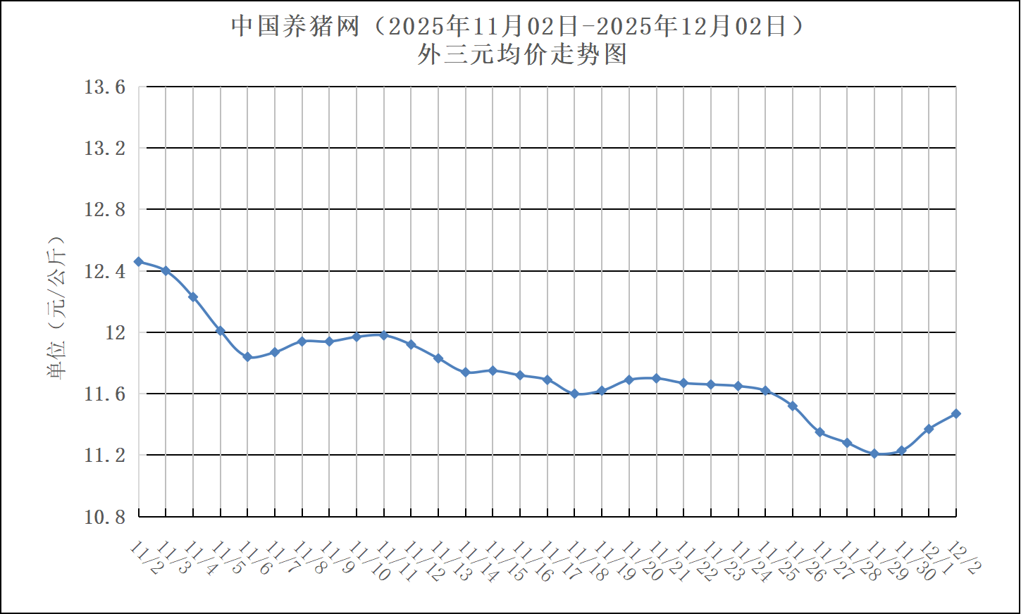 2025年11月02日-2025年12月02日中国养猪网生猪(外三元)均价走势图