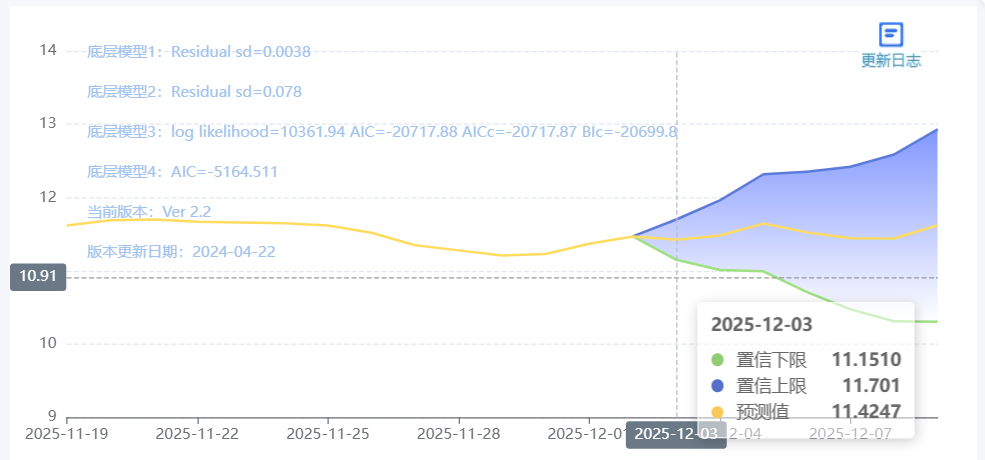 玄田算法是由项目课题组团队原创的非经典逻辑数值聚合理论和不确定性预测方法,构建了基于一致模算子的生猪价格预测模型。该模型采用的聚合函数及一致模相关理论与方法已获得多项国家自然科学基金和省级自然科学资金资助,并获得多项省级自然科学奖奖项。12月03日预测猪价为11.3402,置信区间在10.8724--11.8081之间。12月04日预测猪价为11.3955;12月05日预测猪价为11.5550。