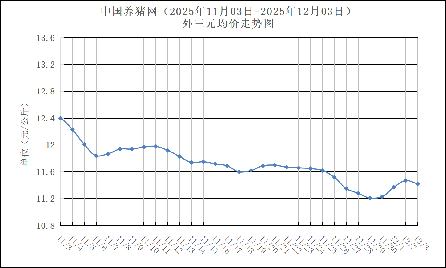 2025年11月03日-2025年12月03日中国养猪网生猪(外三元)均价走势图