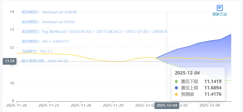 玄田算法是由项目课题组团队原创的非经典逻辑数值聚合理论和不确定性预测方法,构建了基于一致模算子的生猪价格预测模型。该模型采用的聚合函数及一致模相关理论与方法已获得多项国家自然科学基金和省级自然科学资金资助,并获得多项省级自然科学奖奖项。12月04日预测猪价为11.4833,置信区间在11.0123--11.9626之间。12月05日预测猪价为11.6453;12月06日预测猪价为11.5257。