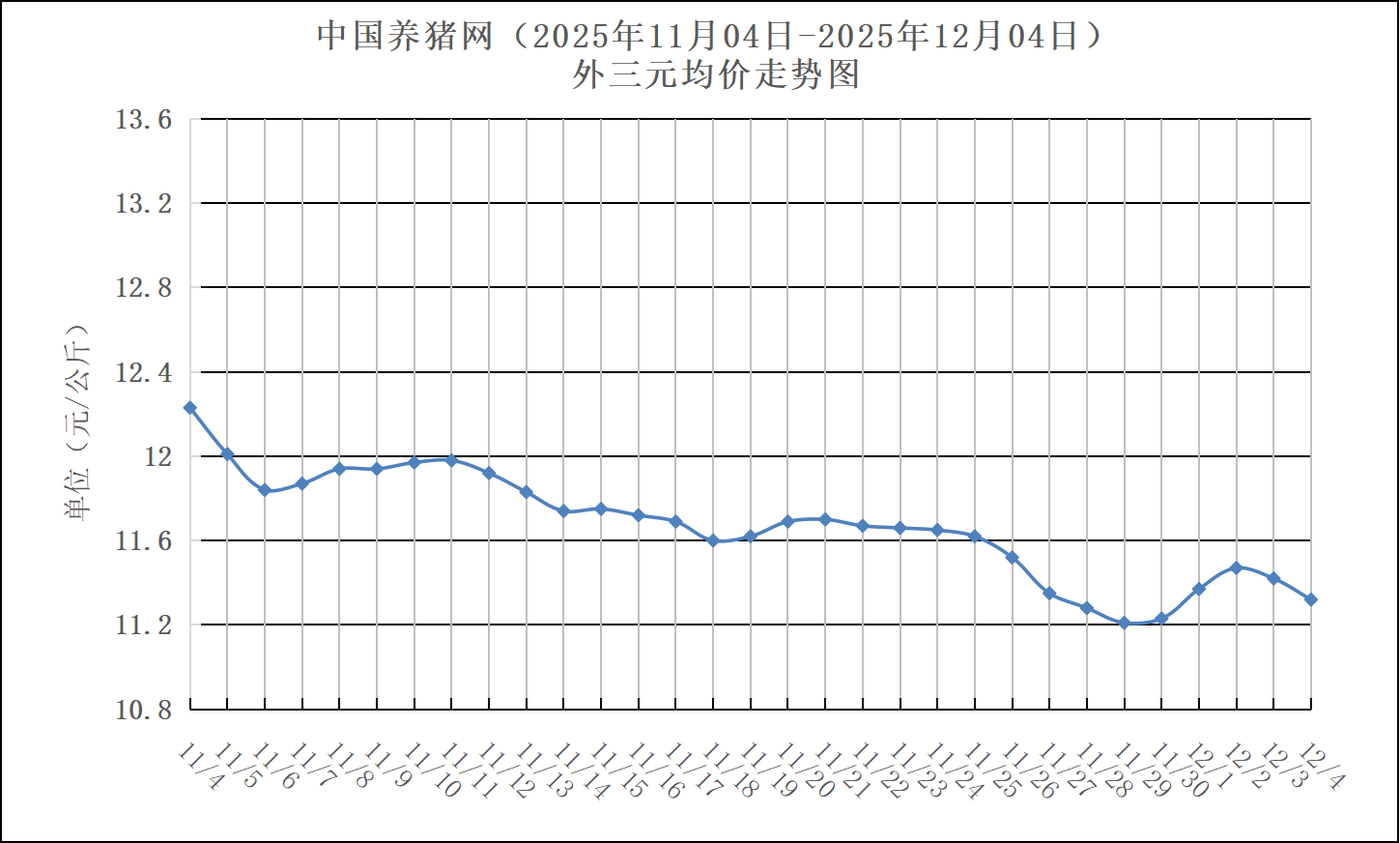2025年12月04日(星期四),中国养猪网猪价系统数据监测如下:生猪(品种:外三元)均价为11.32元/公斤(5.66元/斤),价格较昨日下跌了0.10元/公斤(0.05元/斤);猪价环比下跌7.44%,同比下跌30.17%。