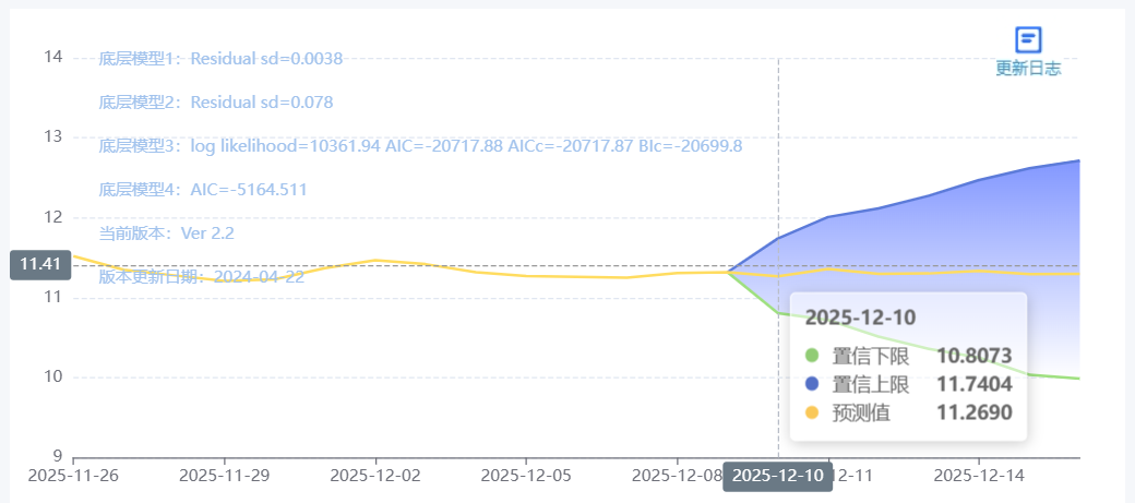 玄田算法是由项目课题组团队原创的非经典逻辑数值聚合理论和不确定性预测方法,构建了基于一致模算子的生猪价格预测模型。该模型采用的聚合函数及一致模相关理论与方法已获得多项国家自然科学基金和省级自然科学资金资助,并获得多项省级自然科学奖奖项。12月10日预测猪价为11.2690,置信区间在10.8073-11.7404之间。12月11日预测猪价为11.3589;12月12日预测猪价为11.3003。