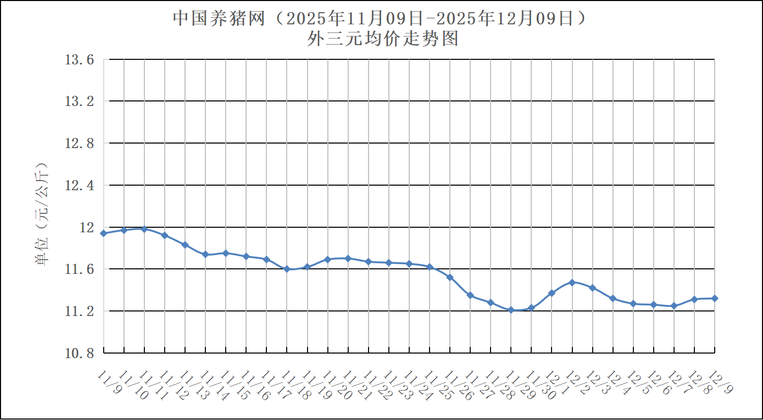 2025年11月09日-2025年12月09日中国养猪网生猪(外三元)均价走势图