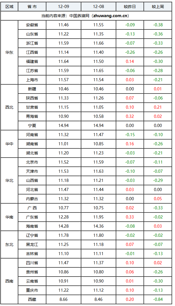 2025年12月09日-中国养猪网生猪(外三元)均价涨跌表