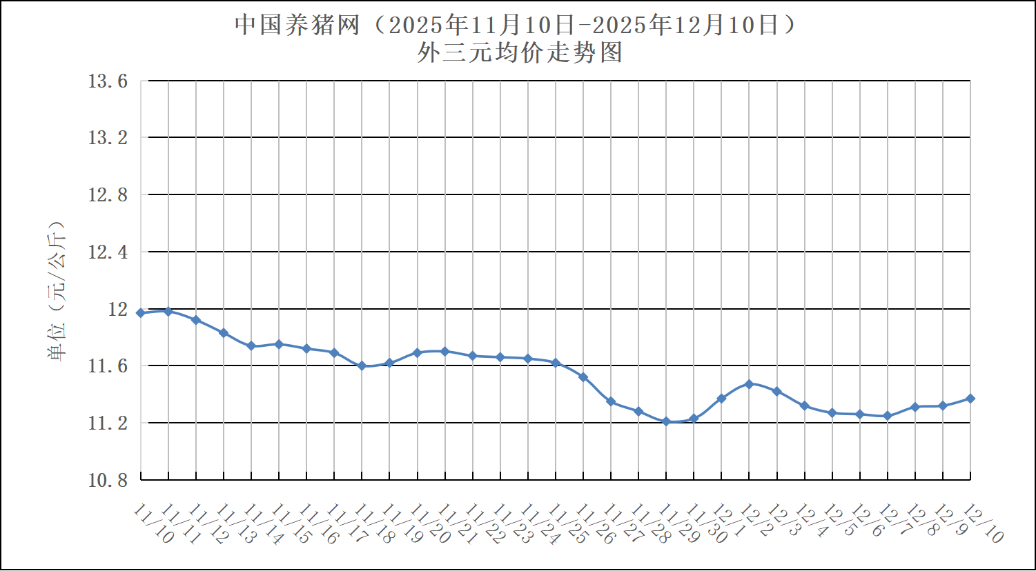 2025年11月10日-2025年12月10日中国养猪网生猪(外三元)均价走势图