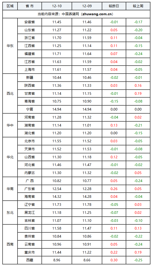 2025年12月10日-中国养猪网生猪(外三元)均价涨跌表