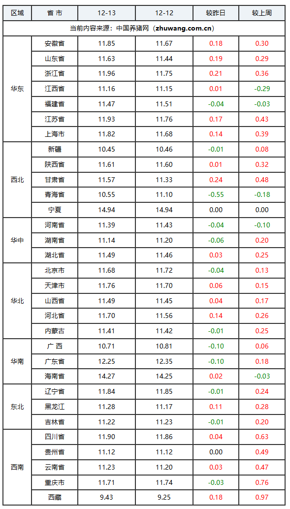 2025年12月13日-中国养猪网生猪(外三元)均价涨跌表
