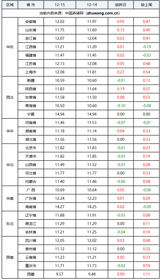 2025年12月15日-中国养猪网生猪(外三元)均价涨跌表