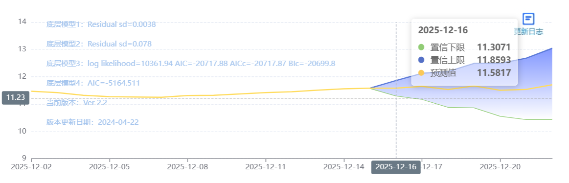 玄田算法是由项目课题组团队原创的非经典逻辑数值聚合理论和不确定性预测方法,构建了基于一致模算子的生猪价格预测模型。该模型采用的聚合函数及一致模相关理论与方法已获得多项国家自然科学基金和省级自然科学资金资助,并获得多项省级自然科学奖奖项。12月16日预测猪价为11.5477,置信区间在10.8933--12.216之间。12月17日预测猪价为11.5763;12月18日预测猪价为11.6580。