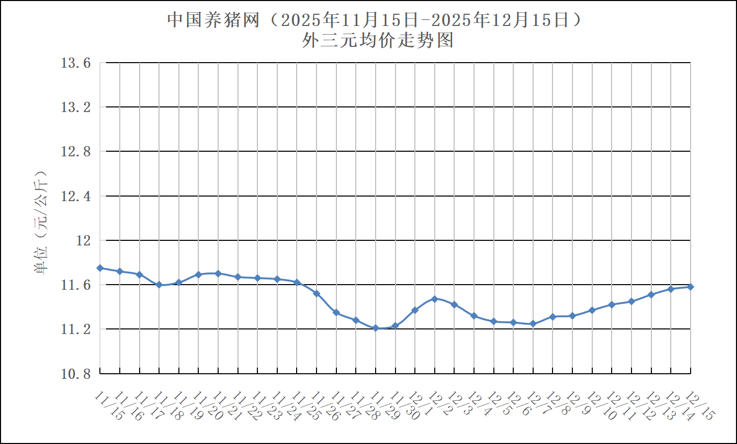 2025年11月15日-2025年12月15日中国养猪网生猪(外三元)均价走势图