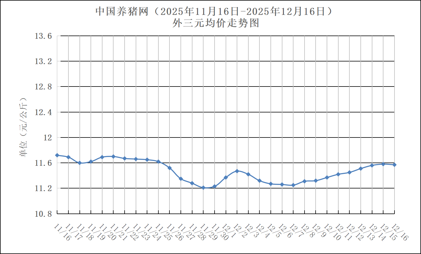 2025年11月16日-2025年12月16日中国养猪网生猪(外三元)均价走势图