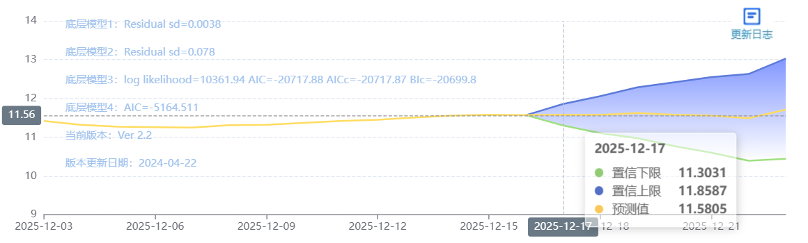 玄田算法是由项目课题组团队原创的非经典逻辑数值聚合理论和不确定性预测方法,构建了基于一致模算子的生猪价格预测模型。该模型采用的聚合函数及一致模相关理论与方法已获得多项国家自然科学基金和省级自然科学资金资助,并获得多项省级自然科学奖奖项。12月17日预测猪价为11.6461,置信区间在11.1797--12.1244之间。12月18日预测猪价为11.5319;12月19日预测猪价为11.6633。