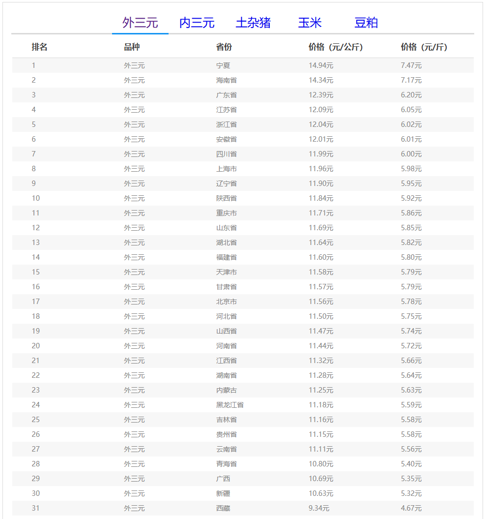 2025年12月16日-中国养猪网生猪(外三元)均价排行榜