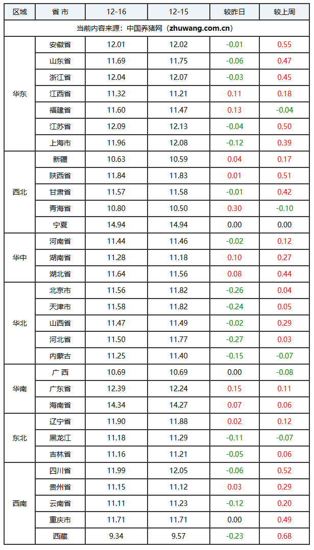 2025年12月16日-中国养猪网生猪(外三元)均价涨跌表