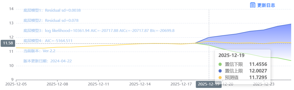 玄田算法是由项目课题组团队原创的非经典逻辑数值聚合理论和不确定性预测方法,构建了基于一致模算子的生猪价格预测模型。该模型采用的聚合函数及一致模相关理论与方法已获得多项国家自然科学基金和省级自然科学资金资助,并获得多项省级自然科学奖奖项。12月19日预测猪价为11.6565,置信区间在11.1895--12.1326之间。12月20日预测猪价为11.6477;12月21日预测猪价为11.5741。