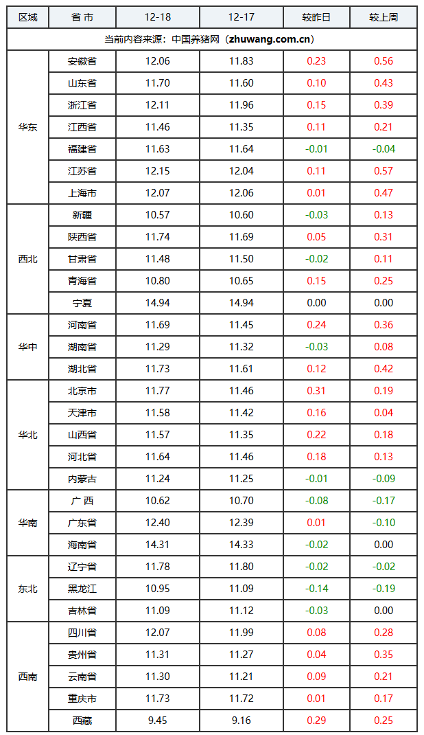 2025年12月18日-中国养猪网生猪(外三元)均价排行榜