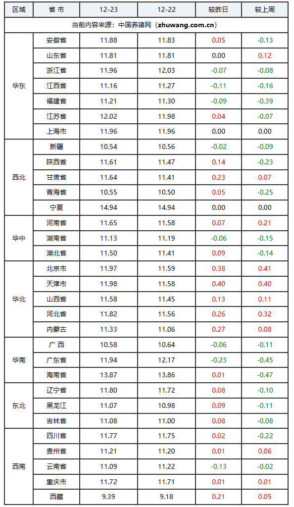根据“2025年12月23日-中国养猪网生猪(外三元)均价涨跌表”发现,全国生猪市场呈现微涨态势。外三元生猪均价约为11.49元/公斤,较昨日上涨0.02元/公斤,虽然冬至前后猪价遇冷,呈滑坡下跌的局面,但节后猪价底部支撑升温,支撑猪价回调。此次猪价上涨主要是新一轮雨雪天气,有望刺激南方腌腊需求,从而增强消费支撑;同时,猪价下跌至低位后,市场抄底心态升温,二次育肥户逢低补栏标猪,对猪价形成一定支撑;此外,随着12月渐入尾声,部分头部猪企因猪病影响出栏计划减少,养殖端惜售挺价情绪转强,加上元旦节前下游备货需求预期,屠宰场开工率或回升。因此,尽管机构此前普遍看空节后前景,但猪价仍有一定支撑,需重点关注规模猪企出栏和屠宰场开工率的变化。