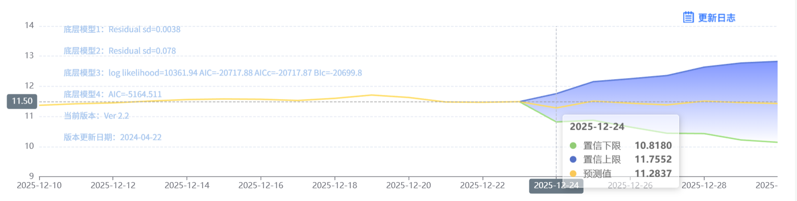 玄田算法是由项目课题组团队原创的非经典逻辑数值聚合理论和不确定性预测方法,构建了基于一致模算子的生猪价格预测模型。该模型采用的聚合函数及一致模相关理论与方法已获得多项国家自然科学基金和省级自然科学资金资助,并获得多项省级自然科学奖奖项。12月24日预测猪价为11.2837,置信区间在10.8180--11.7552之间。12月25日预测猪价为11.5092;12月26日预测猪价为11.4390。