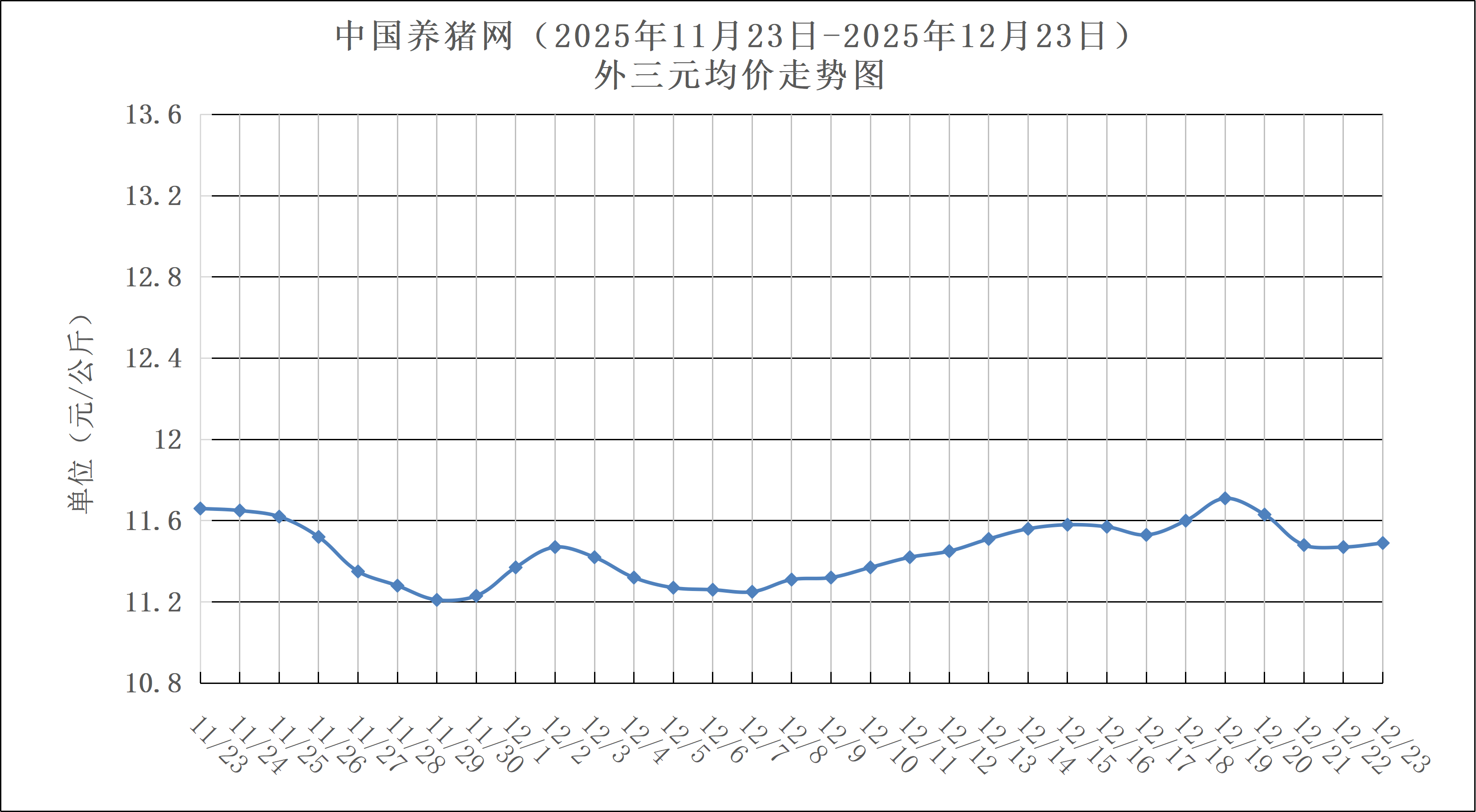 2025年12月23日(星期二),中国养猪网猪价系统数据监测如下:生猪(品种:外三元)均价为11.49元/公斤(5.745元/斤),价格较昨日上涨了0.02元/公斤(0.01元/斤);猪价环比下跌1.46%,同比下跌24.90%。