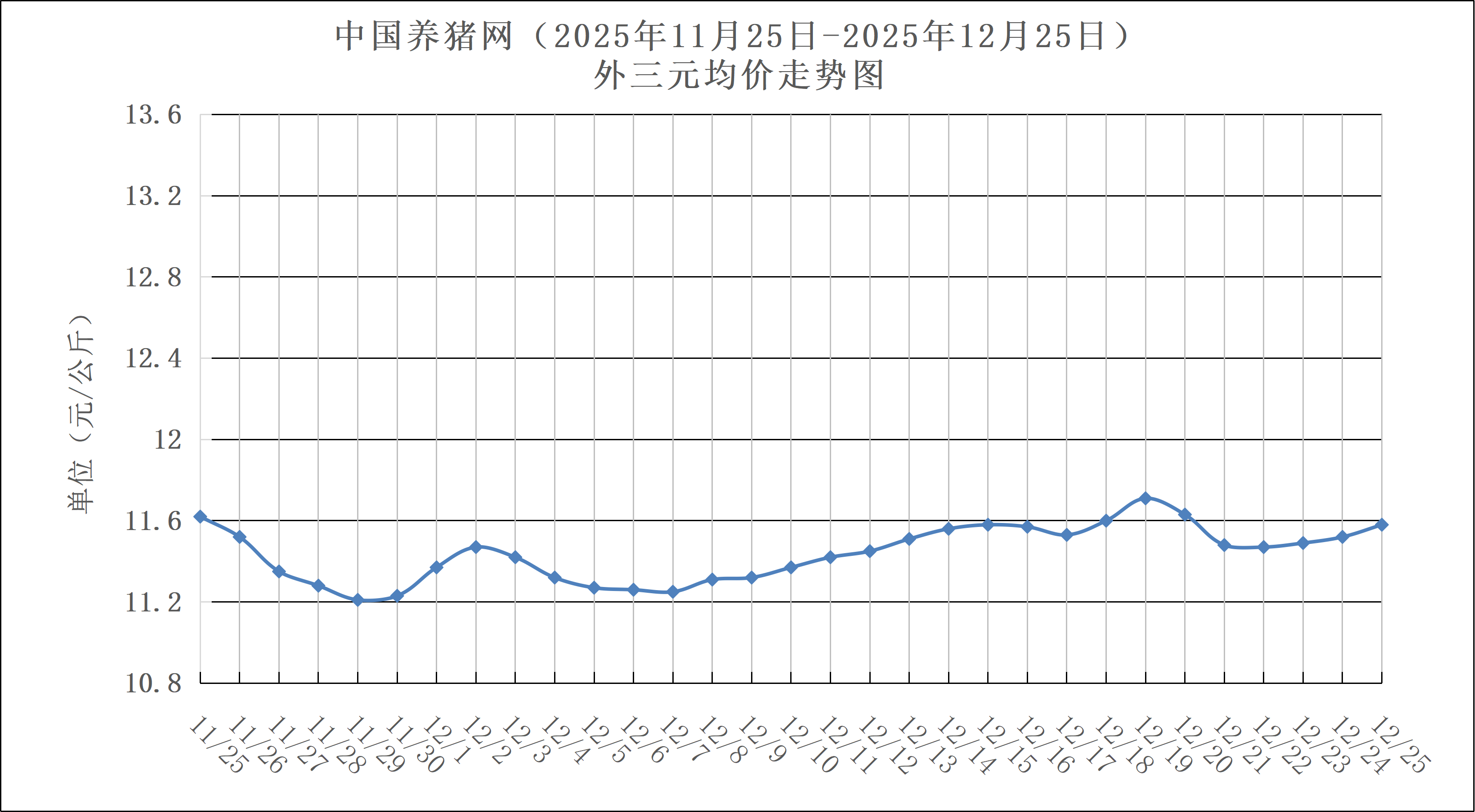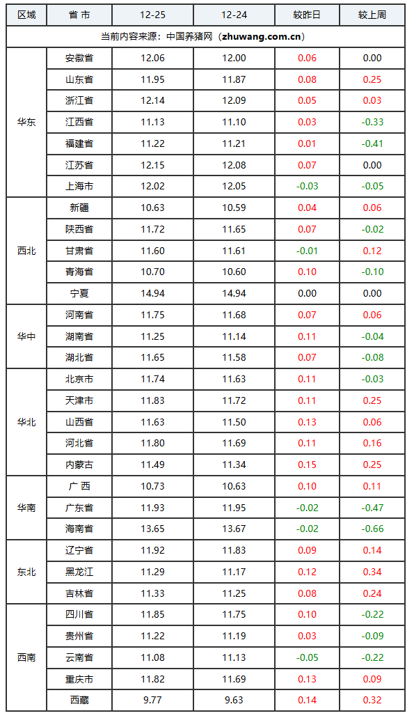 2025年12月25日(星期四),中国养猪网猪价系统数据监测如下:生猪(品种:外三元)均价为11.58元/公斤(5.79元/斤),价格较昨日上涨了0.06元/公斤(0.03元/斤);猪价环比下跌0.34%,同比下跌25.53%。