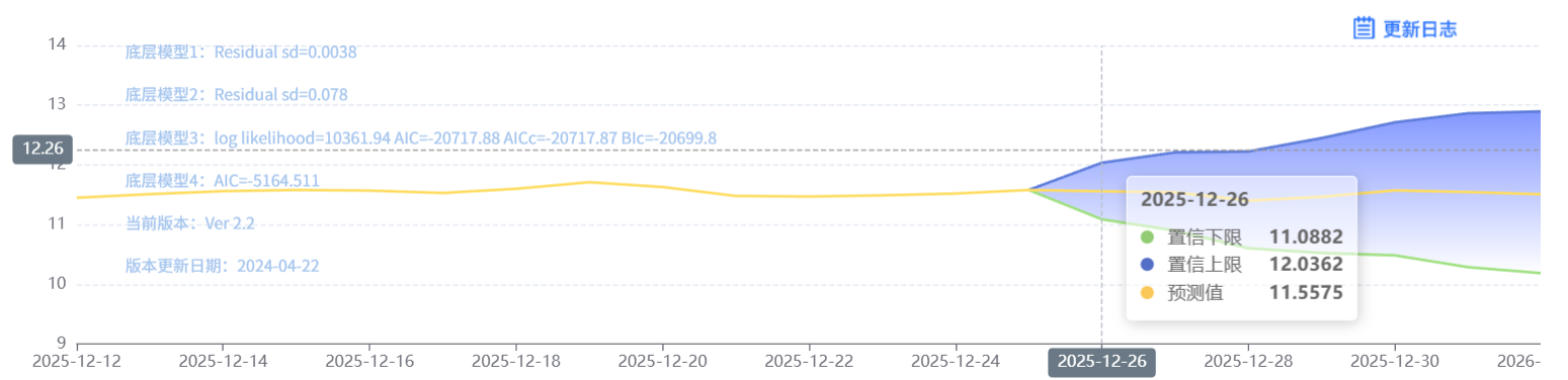 玄田算法是由项目课题组团队原创的非经典逻辑数值聚合理论和不确定性预测方法,构建了基于一致模算子的生猪价格预测模型。该模型采用的聚合函数及一致模相关理论与方法已获得多项国家自然科学基金和省级自然科学资金资助,并获得多项省级自然科学奖奖项。12月26日预测猪价为11.5575,置信区间在11.0882--12.0362之间。12月27日预测猪价为11.5411;12月28日预测猪价为11.4010。