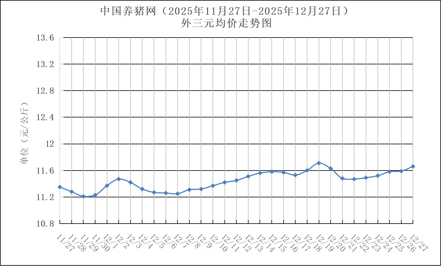 2025年12月27日(星期六),中国养猪网猪价系统数据监测如下:生猪(品种:外三元)均价为11.66元/公斤(5.83元/斤),价格较昨日上涨了0.07元/公斤(0.04元/斤);猪价环比上涨2.73%,同比下跌25.92%。