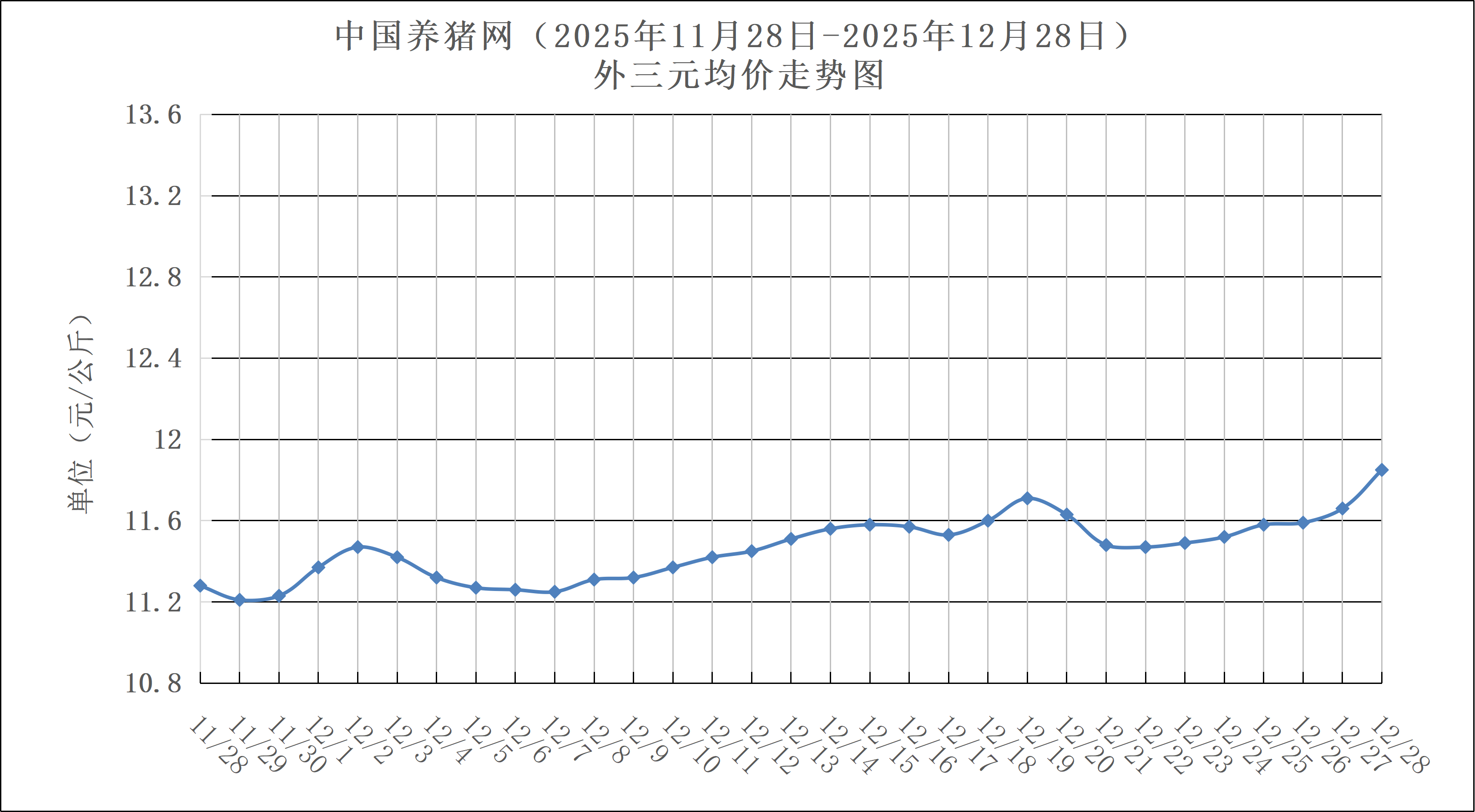 2025年12月28日(星期日),中国养猪网猪价系统数据监测如下:生猪(品种:外三元)均价为11.85元/公斤(5.925元/斤),价格较昨日上涨了0.19元/公斤(0.095元/斤);猪价环比上涨5.05%,同比下跌24.43%。