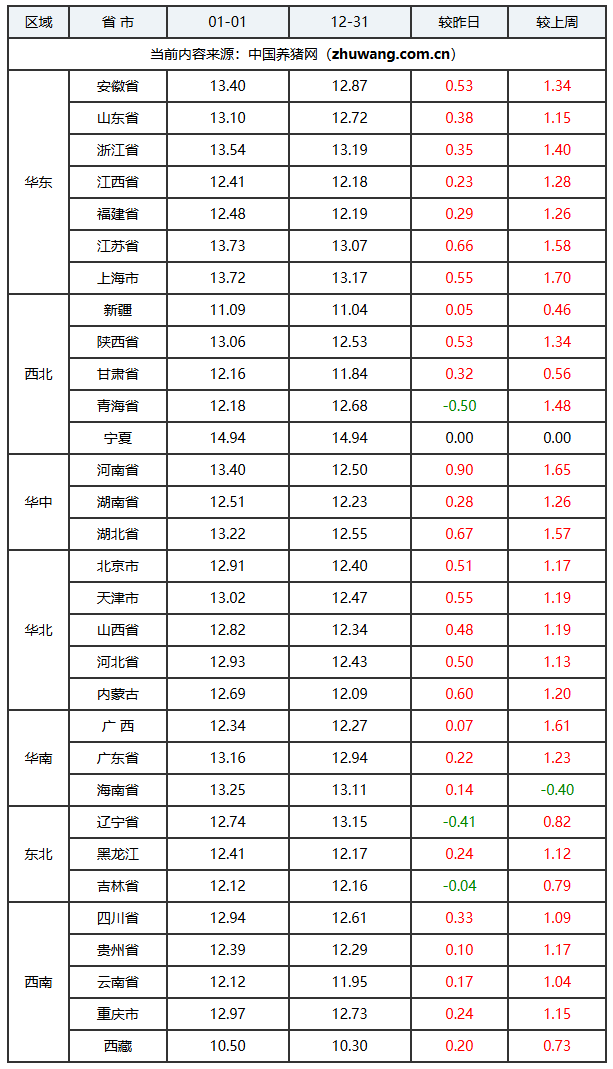 2026年01月01日-中国养猪网生猪(外三元)均价涨跌表