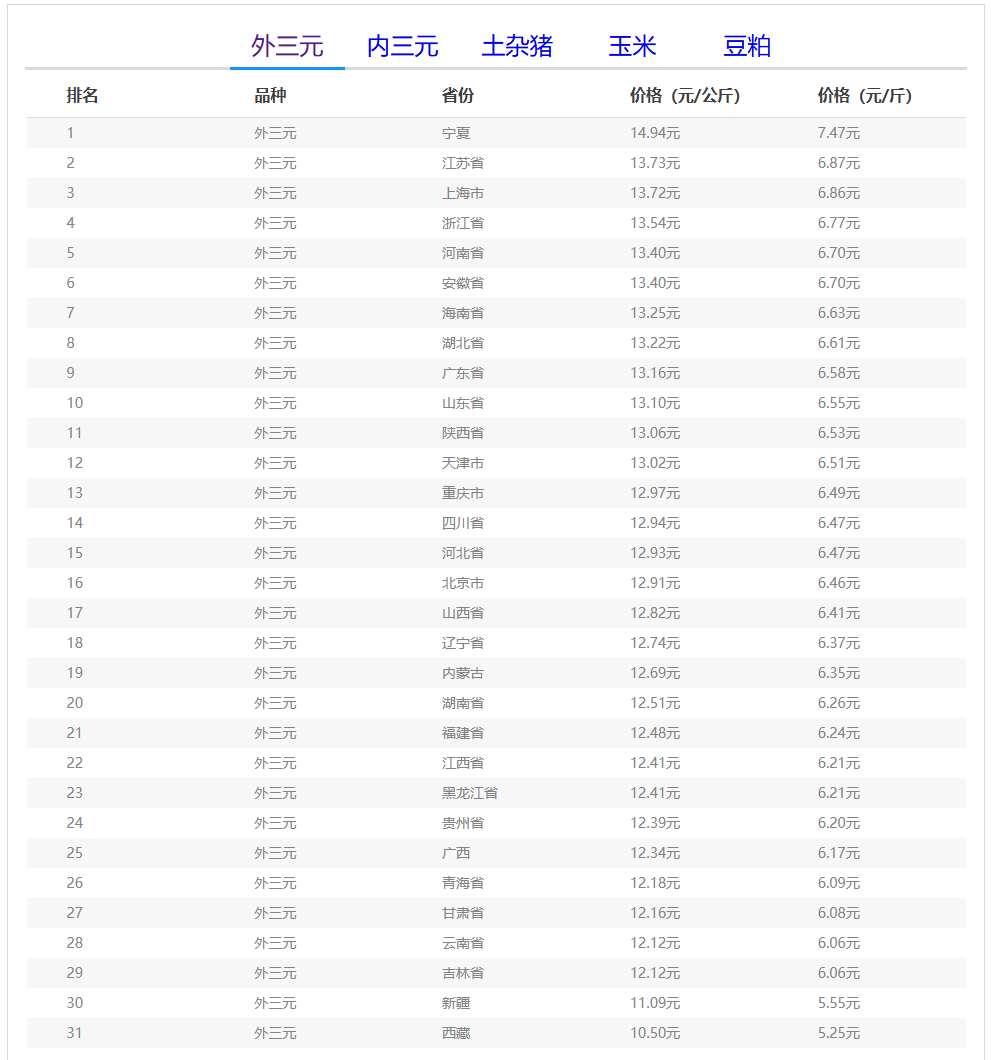 2026年01月01日-中国养猪网生猪(外三元)均价排行榜