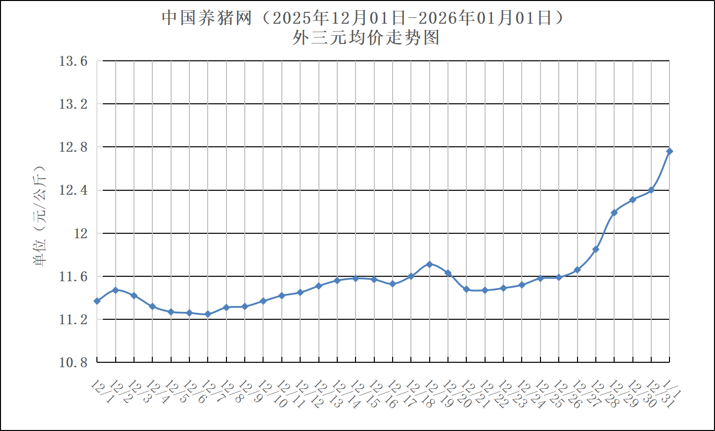 2025年12月01日-2026年01月01日中国养猪网生猪(外三元)均价走势图