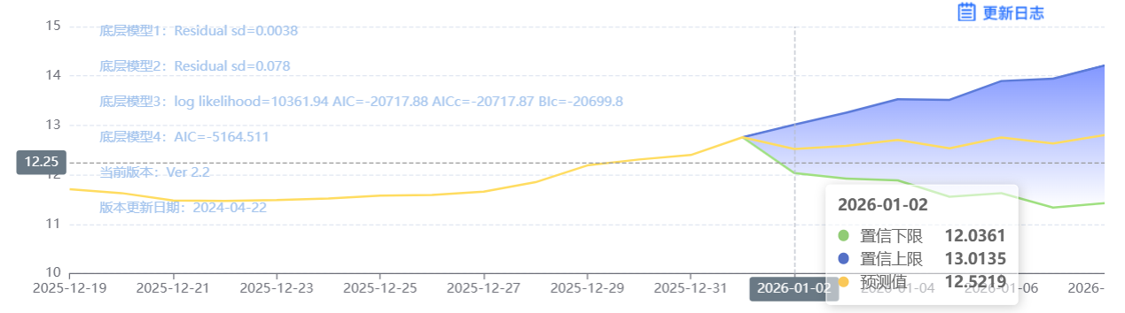 玄田算法是由项目课题组团队原创的非经典逻辑数值聚合理论和不确定性预测方法,构建了基于一致模算子的生猪价格预测模型。该模型采用的聚合函数及一致模相关理论与方法已获得多项国家自然科学基金和省级自然科学资金资助,并获得多项省级自然科学奖奖项。01月01日预测猪价为12.4965,置信区间在12.0125--12.9927之间。01月02日预测猪价为12.5143;01月03日预测猪价为12.5373。