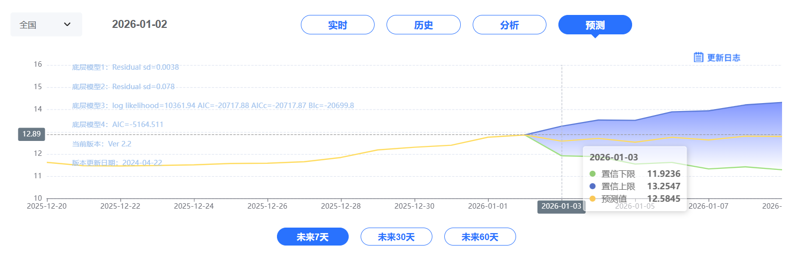 玄田算法是由项目课题组团队原创的非经典逻辑数值聚合理论和不确定性预测方法,构建了基于一致模算子的生猪价格预测模型。该模型采用的聚合函数及一致模相关理论与方法已获得多项国家自然科学基金和省级自然科学资金资助,并获得多项省级自然科学奖奖项。01月03日预测猪价为12.5845,置信区间在11.9236--13.2547之间。01月04日预测猪价为12.7074;01月05日预测猪价为12.5354。