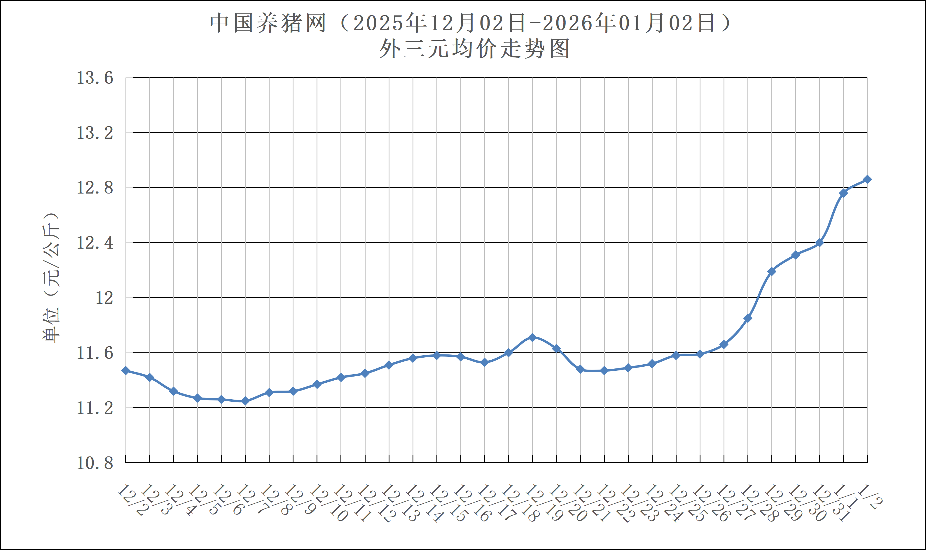 2025年12月02日-2026年01月02日中国养猪网生猪(外三元)均价走势图