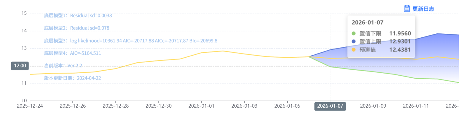 玄田算法是由项目课题组团队原创的非经典逻辑数值聚合理论和不确定性预测方法,构建了基于一致模算子的生猪价格预测模型。该模型采用的聚合函数及一致模相关理论与方法已获得多项国家自然科学基金和省级自然科学资金资助,并获得多项省级自然科学奖奖项。01月07日预测猪价为12.4381,置信区间在11.9560--12.9301之间。01月08日预测猪价为12.4637;01月09日预测猪价为12.4891。