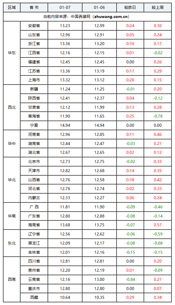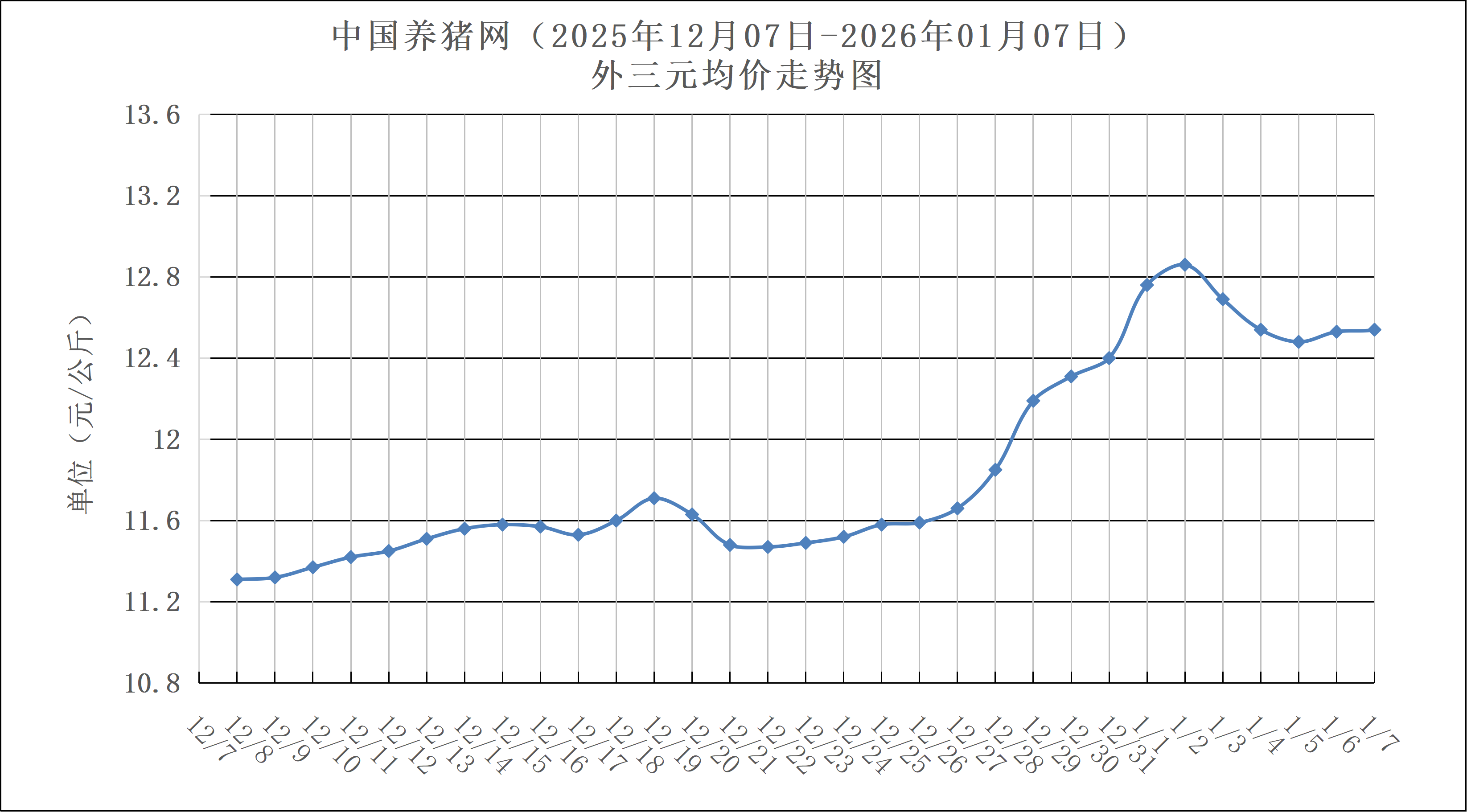 2025年01月07日(星期三),中国养猪网猪价系统数据监测如下:生猪(品种:外三元)均价为12.54元/公斤(6.27元/斤),价格较昨日上涨了0.01元/公斤(0.005元/斤);猪价环比上涨11.47%,同比下跌23.44%。