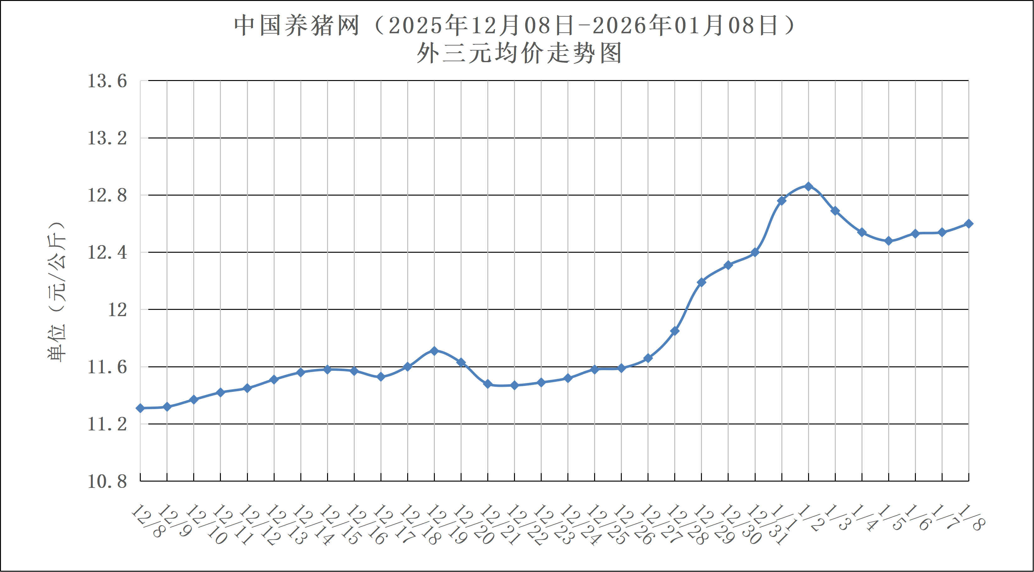 2025年12月08日-2026年01月08日中国养猪网生猪(外三元)均价走势图
