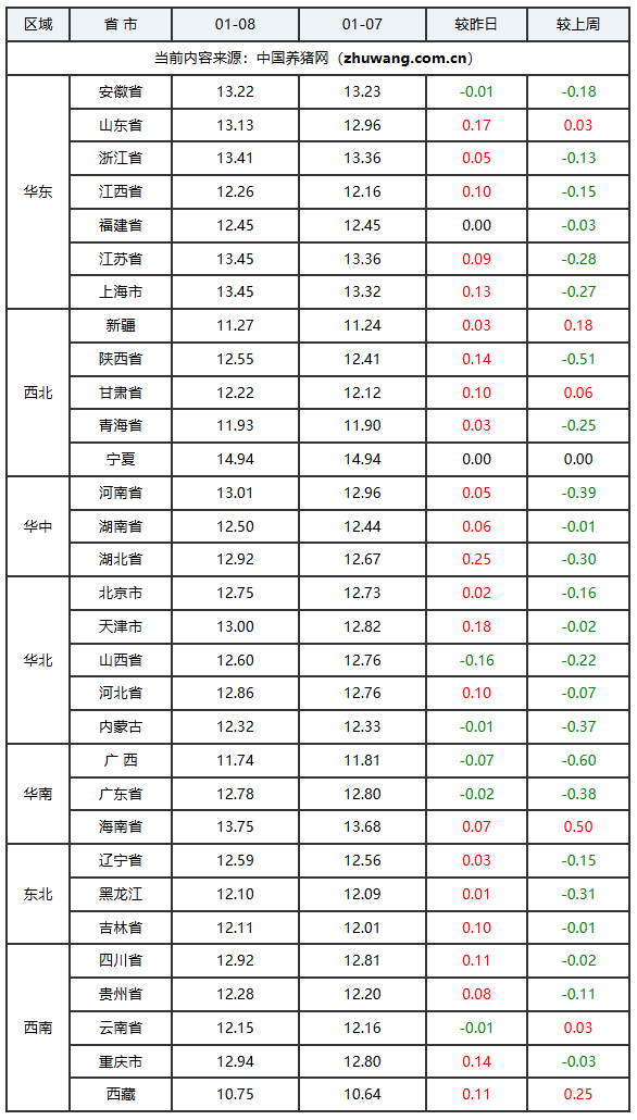 2026年01月08日-中国养猪网生猪(外三元)均价涨跌表