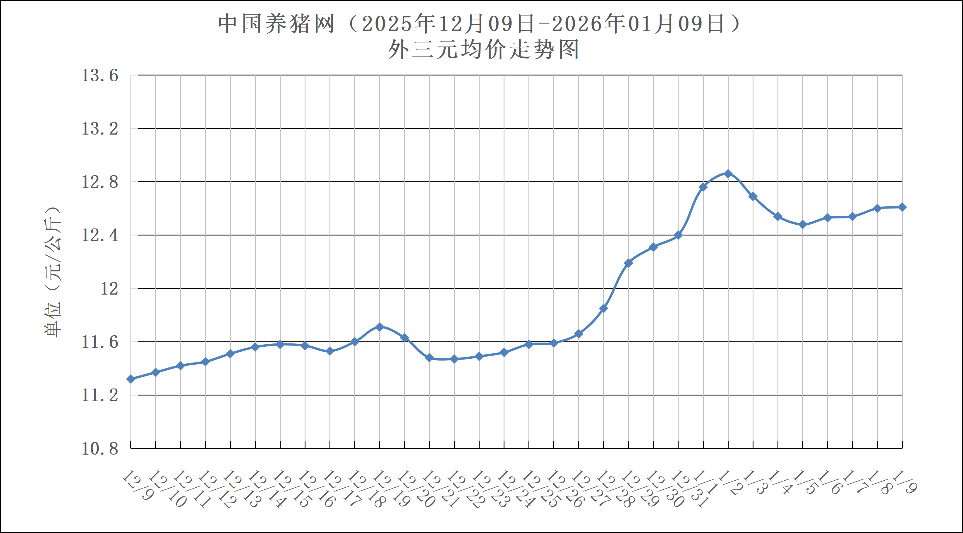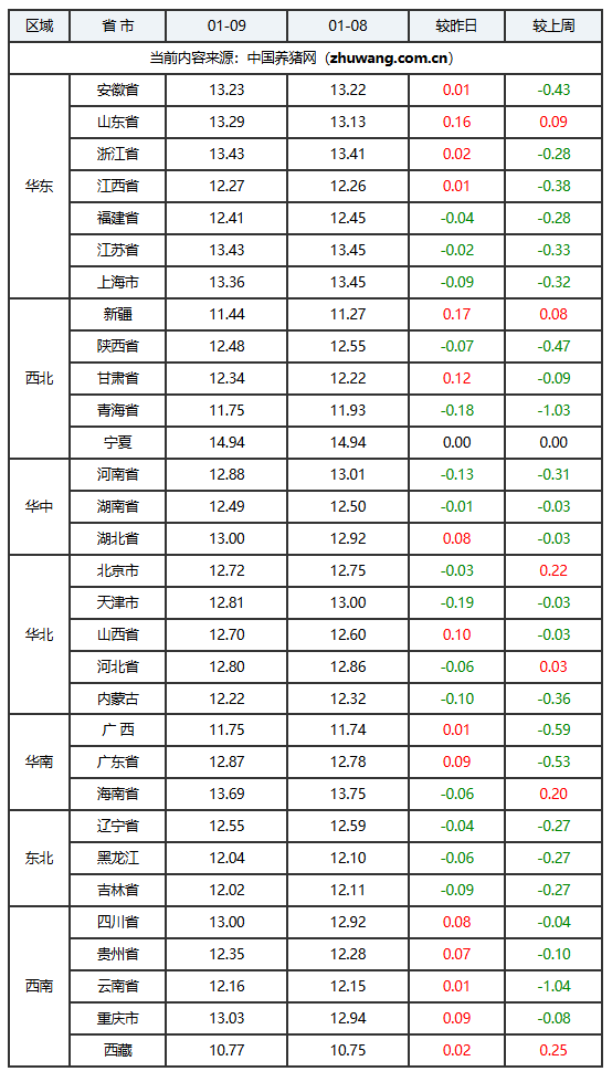 2025年01月09日(星期五),中国养猪网猪价系统数据监测如下:生猪(品种:外三元)均价为12.61元/公斤(6.305元/斤),价格较昨日上涨了0.01元/公斤(0.005元/斤);猪价环比上涨11.4%,同比下跌20.59%。