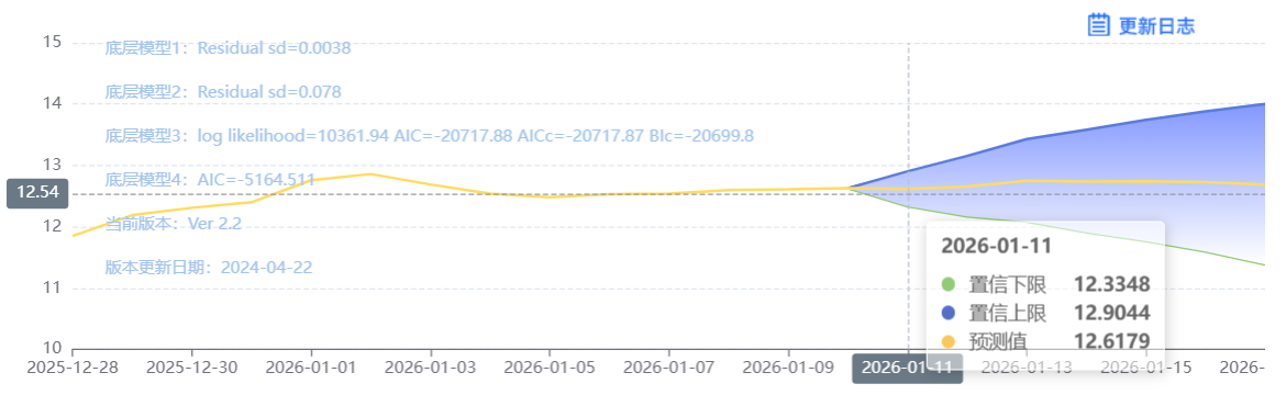 玄田算法是由项目课题组团队原创的非经典逻辑数值聚合理论和不确定性预测方法,构建了基于一致模算子的生猪价格预测模型。该模型采用的聚合函数及一致模相关理论与方法已获得多项国家自然科学基金和省级自然科学资金资助,并获得多项省级自然科学奖奖项。01月10日预测猪价为12.5952,置信区间在12.3116--12.8834之间。01月11日预测猪价为12.7216;01月12日预测猪价为12.7047。
