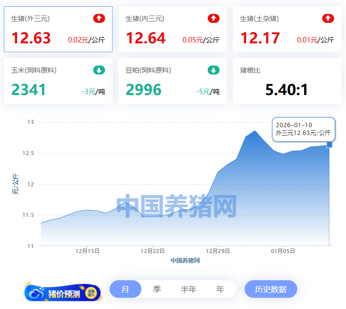 2025年01月10日(星期六),中国养猪网猪价系统数据监测如下:生猪(品种:外三元)均价为12.63元/公斤(6.32元/斤),价格较昨日上涨了0.02元/公斤(0.01元/斤);猪价环比上涨11.08%,同比下跌23.03%。