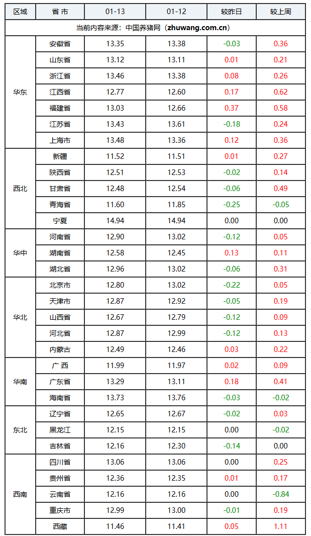 2026年01月13日-中国养猪网生猪(外三元)均价排行榜