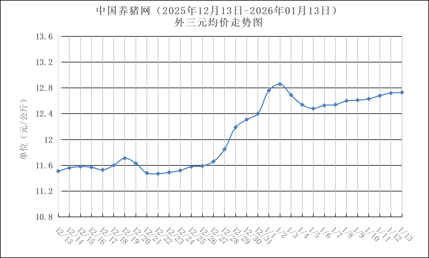 2026年01月13日-中国养猪网生猪(外三元)均价涨跌表根据“2026年01月13日-中国养猪网生猪(外三元)均价涨跌表”发现,全国生猪价格整体呈现窄幅偏强震荡的走势,全国生猪出栏均价约为12.73元/公斤,较昨日有轻微上涨。当前市场供需呈现“双减”格局,一方面,由于月初规模场出栏计划量有限,加之散户普遍存在压栏惜售心态,导致市场标猪供应阶段性偏紧,支撑了价格;另一方面,终端消费支撑力仍显不足,南方腌腊需求已基本结束,而北方的春节备货效应尚未全面启动,使得屠宰企业订单减少,开工率维持在较低水平。展望短期,猪价预计将延续窄幅震荡调整。虽然随着春节临近,节日消费有望对价格形成一定支撑,但由于市场整体供应充足,价格上涨空间有限。建议养殖场户密切关注市场动态,顺时顺势出栏,并做好成本管控与疫病防控。