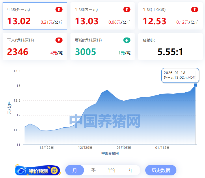 2025年01月18日(星期日),中国养猪网猪价系统数据监测如下:生猪(品种:外三元)均价为13.02元/公斤(6.51元/斤),价格较昨日上涨了0.21元/公斤(0.11元/斤);猪价环比上涨12.24%,同比下跌16.81%。
